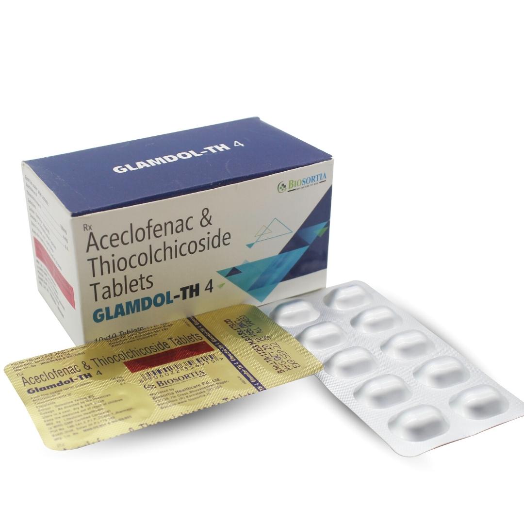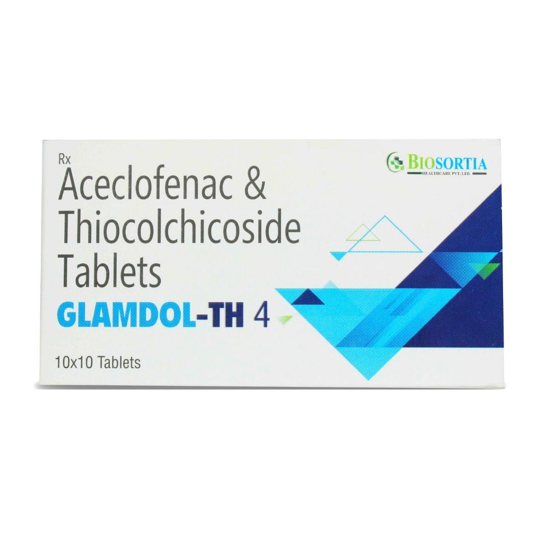 Glamdol-TH 4 Tablet is a combination of two medicines: Aceclofenac and Thiocolchicoside, which relieves pain and relaxes the muscles. Aceclofenac is a non-steroidal anti-inflammatory drug (NSAID) which works by blocking the release of certain chemical messengers that cause pain and inflammation (redness and swelling). Thiocolchicoside is a muscle relaxant. It works on the centres in the brain and spinal cord to relieve muscle stiffness or spasm and to improve pain and movement of muscles.