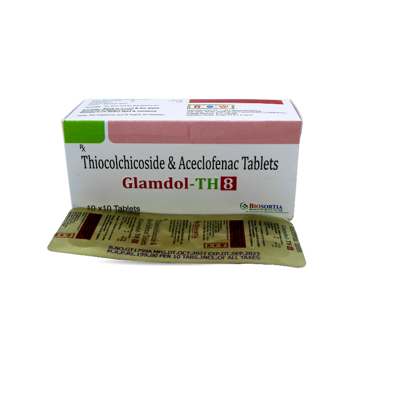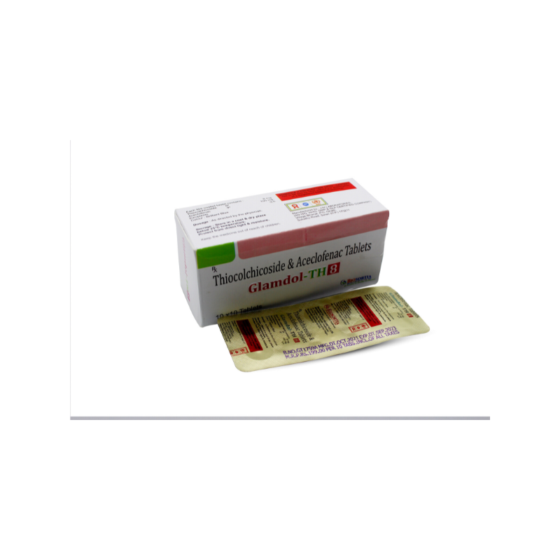 Glamdol-TH 8 Tablet is a combination of two medicines: Aceclofenac and Thiocolchicoside, which relieves pain and relaxes the muscles. Aceclofenac is a non-steroidal anti-inflammatory drug (NSAID) which works by blocking the release of certain chemical messengers that cause pain and inflammation (redness and swelling). Thiocolchicoside is a muscle relaxant. It works on the centres in the brain and spinal cord to relieve muscle stiffness or spasm and to improve pain and movement of muscles.
