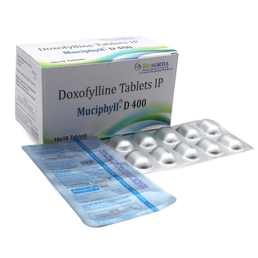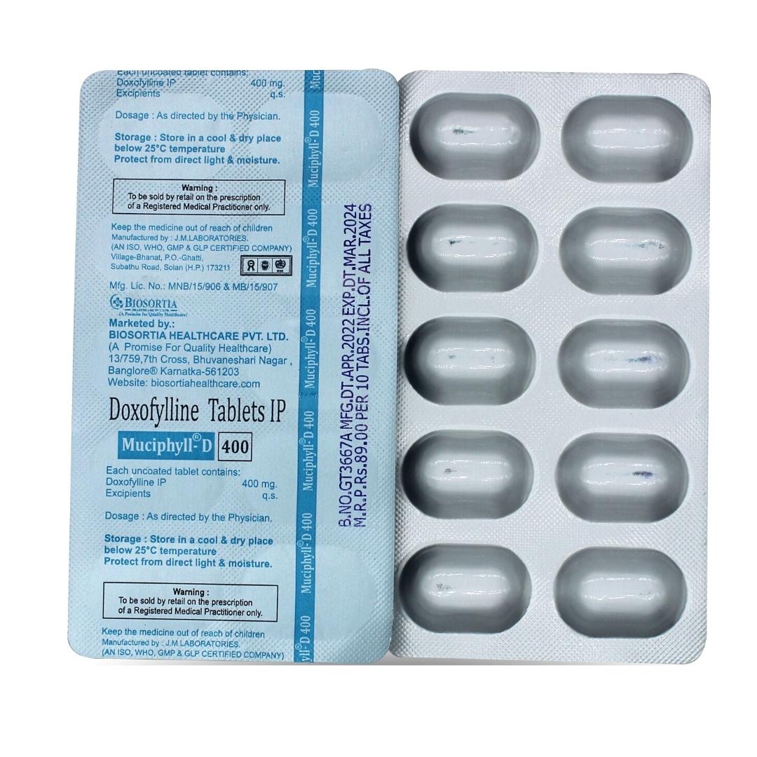 Muciphyll D400 Tablet is used to treat and prevent symptoms of asthma and chronic obstructive pulmonary disorder (a lung disorder in which flow of air to the lung is blocked). It helps in relaxing the muscles of the air passages, thus widening it and making it easier to breathe.