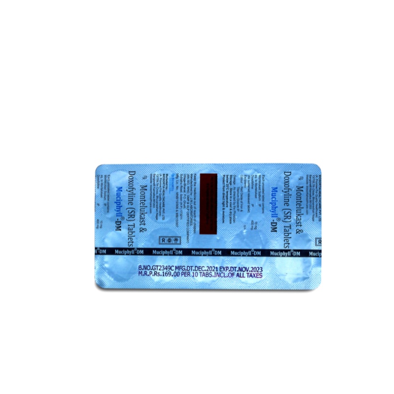 MUCIPHYLL DM TABLET works by blocking the action of leukotriene, a chemical messenger. This reduces inflammation in the airways to prevent asthma and relieve symptoms of allergies.