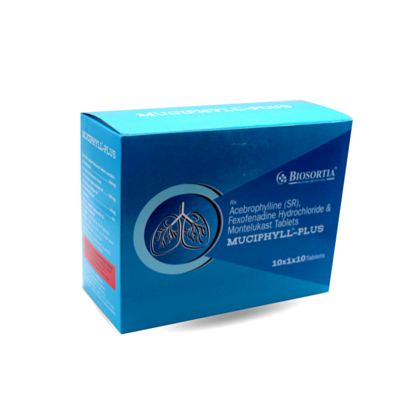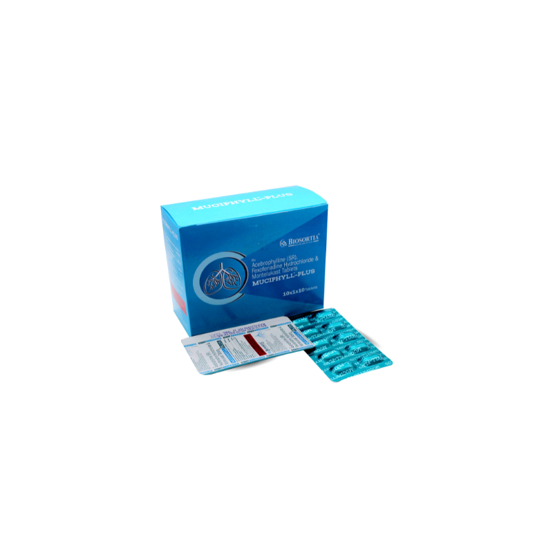Muciphyll Plus 10mg/120mg/200mg Tablet SR is a combination medicine used in the prevention of asthma. It relieves allergy symptoms such as runny nose, stuffy nose, sneezing, watery eyes and congestion or stuffiness. It also helps in relaxing the muscles of the air passages, thus widening it and making it easier to breathe.
