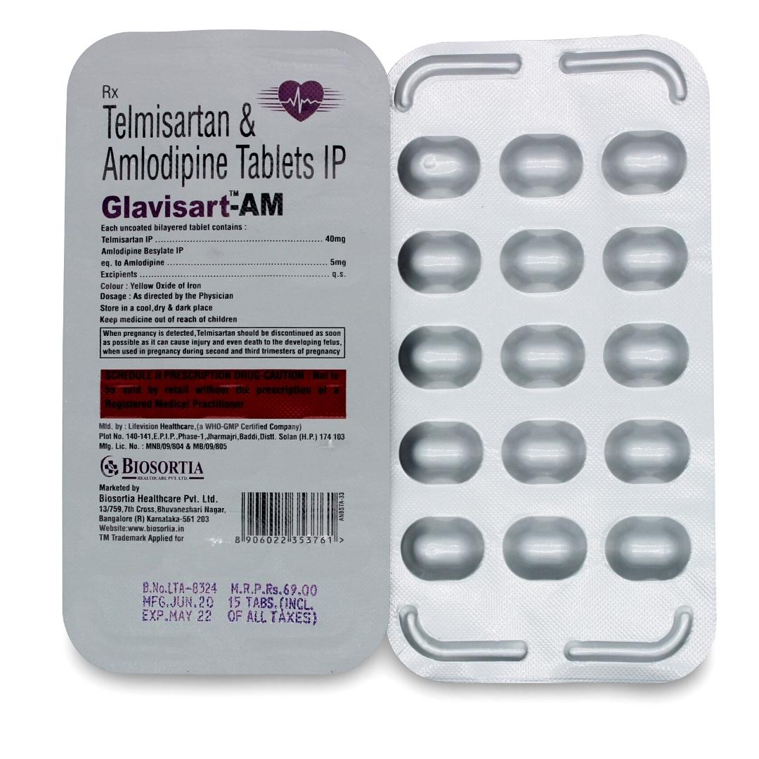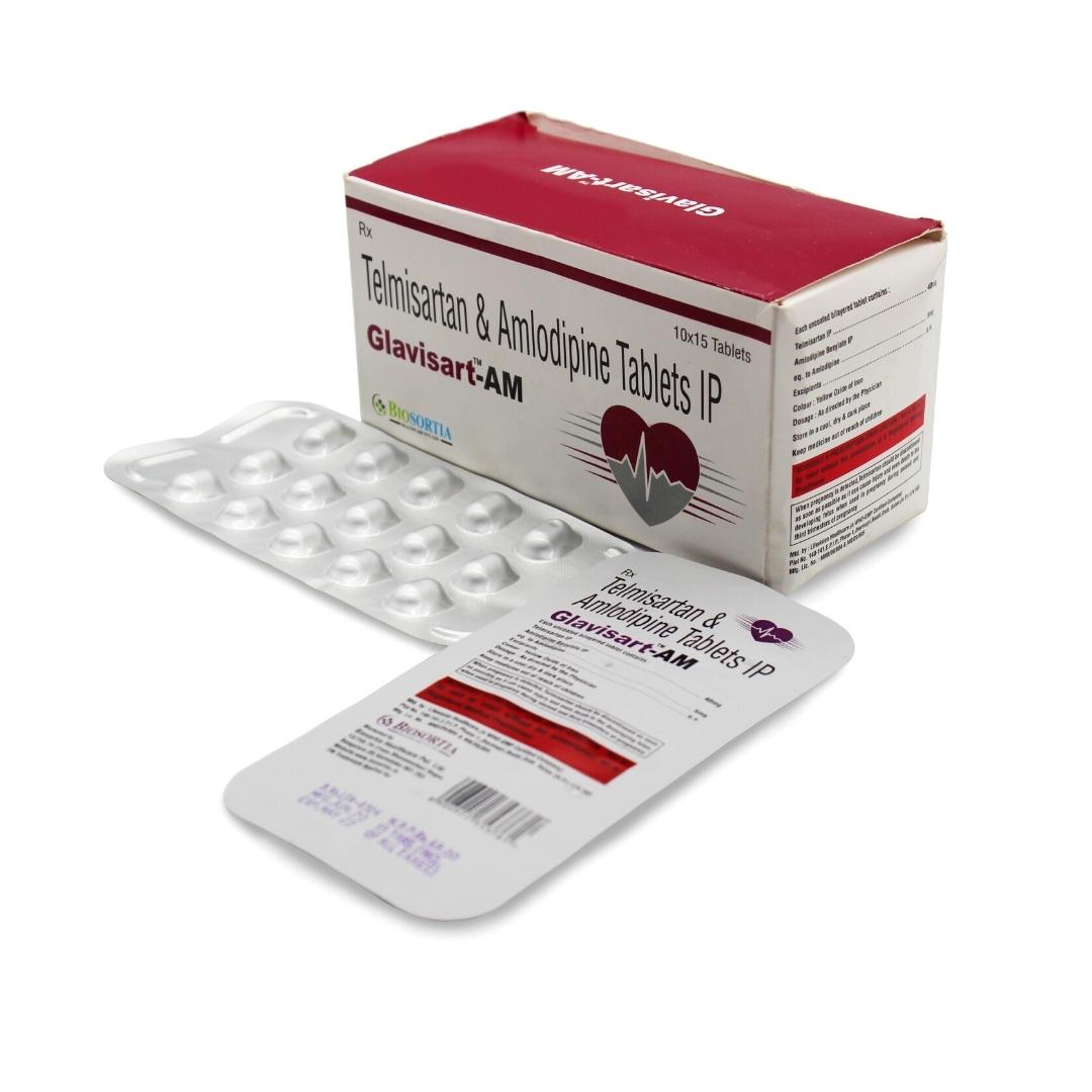 GLAVISART AMTablet is a combination of two medicines: Telmisartan and Amlodipine. Telmisartan is an angiotensin receptor blocker (ARB) and Amlodipine is a calcium channel blocker (CCB). They work by relaxing the blood vessels and making the heart more efficient at pumping blood throughout the body. Together, they lower blood pressure effectively.