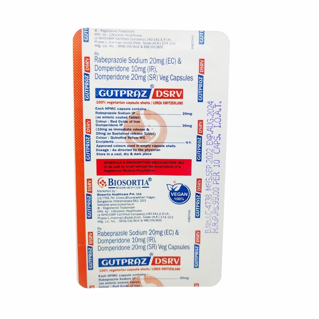 Gutpraz DSRV Capsule is a proton pump inhibitor (PPI). It works by reducing the amount of acid in the stomach which helps in the relief of acid-related indigestion and heartburn.