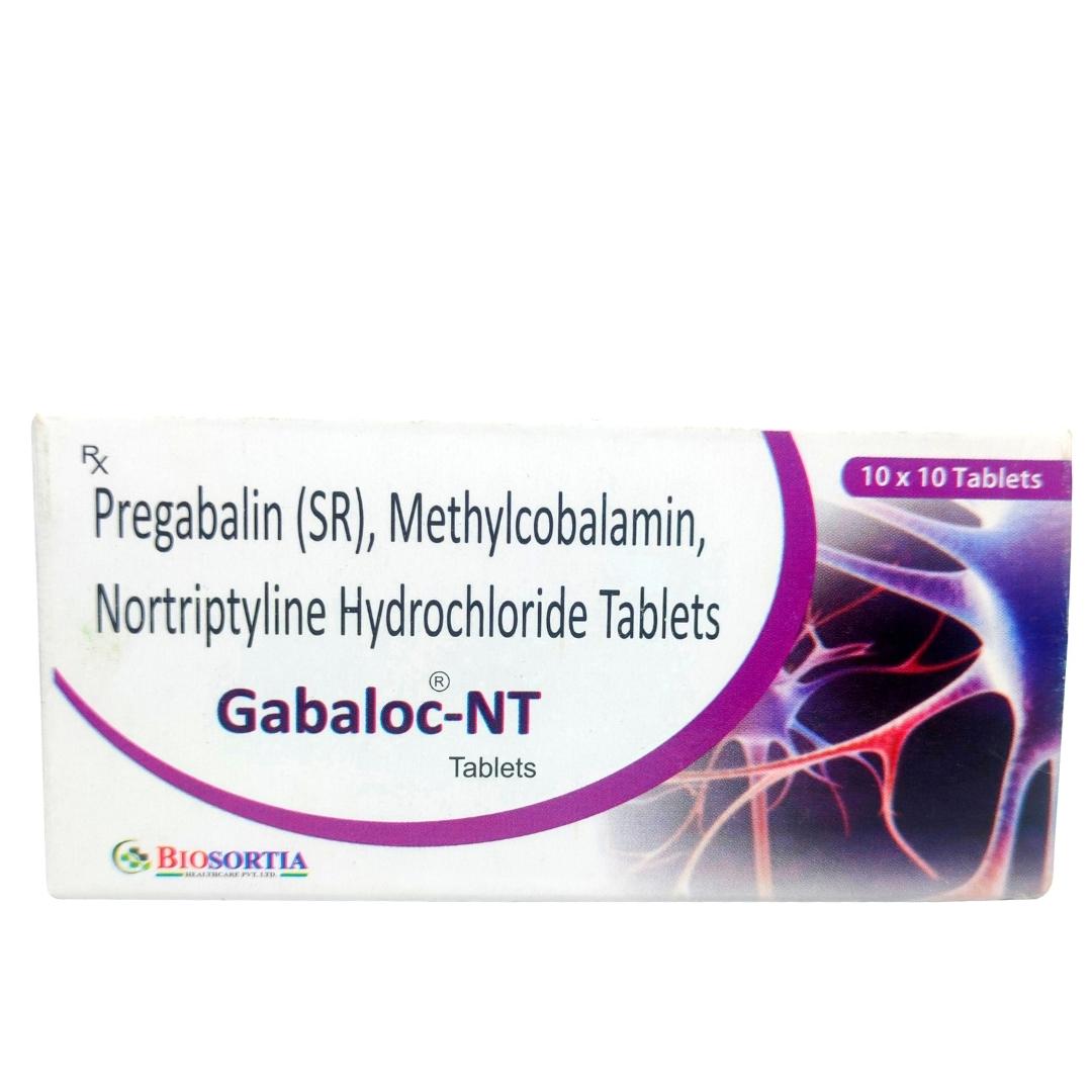 GABALOC NT Tablet is a combination of three medicines: Pregabalin, Nortriptyline, and Methylcobalamin. Pregabalin is an alpha-2 delta ligand that decreases pain by modulating the calcium channel activity of the nerve cells. Nortriptyline is a tricyclic antidepressant that increases the levels of chemical messengers (serotonin and noradrenaline) that stop the movement of pain signals in the brain. Methylcobalamin is a form of vitamin B which helps in the production of myelin, a substance that protects nerve fibers and rejuvenates damaged nerve cells. Together, they relieve neuropathic pain (pain from damaged nerves).